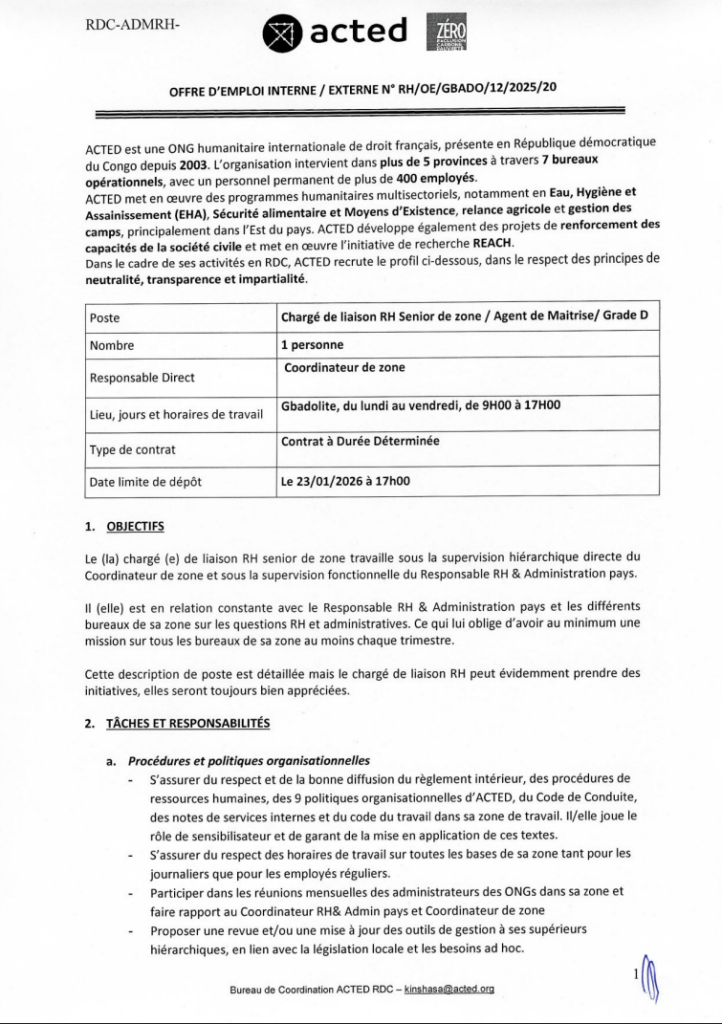 NUMERO DE REFERENCE : RH/OE/GBADO/12/2025/20| Intitulé du poste | Chargé de liaison RH sénior zone |