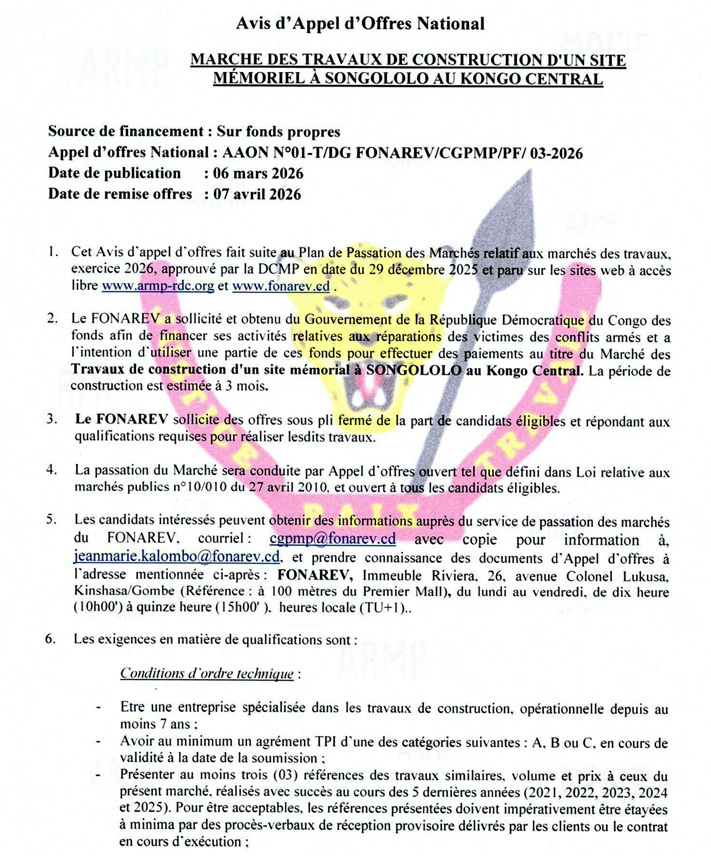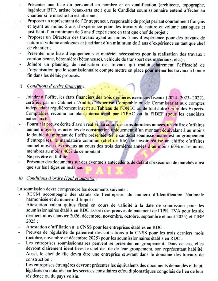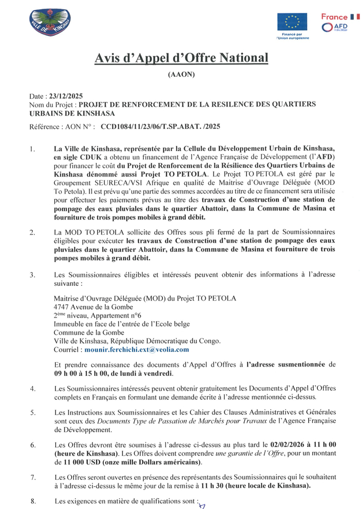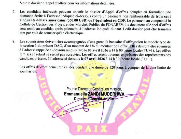 | Retrait des dossiers et soumission des offres | 27/12/2025 au 16/01/2026 | A remettre le 16/01/2026 à 16h00, heure de Kinshasa, au plus tard |