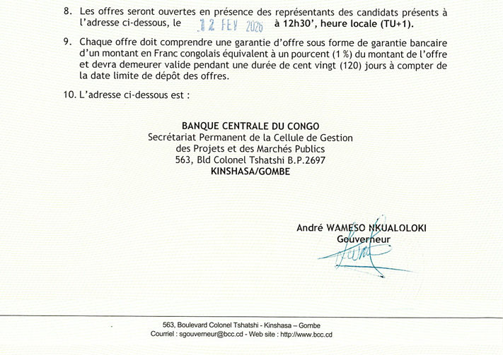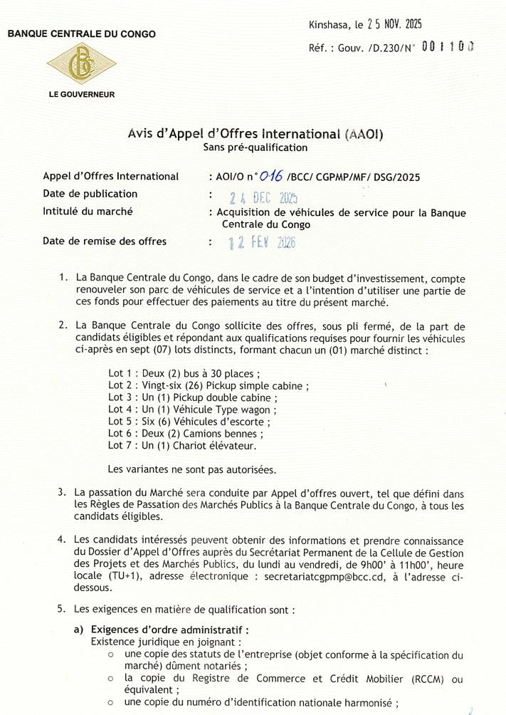 | Intitulé de l’Offre | ACQUISITION DE VEHICULES DE SERVICE POUR LA BANQUE CENTRALE DU CONGO |
