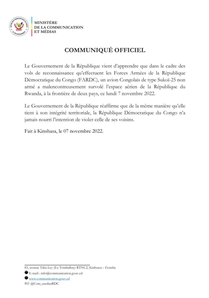 A travers un communiqué du ministère de la Communication et des Médias, le Gouvernement congolais affirme n’avoir jamais eu l’intention de violer l’espace territorial rwandais.