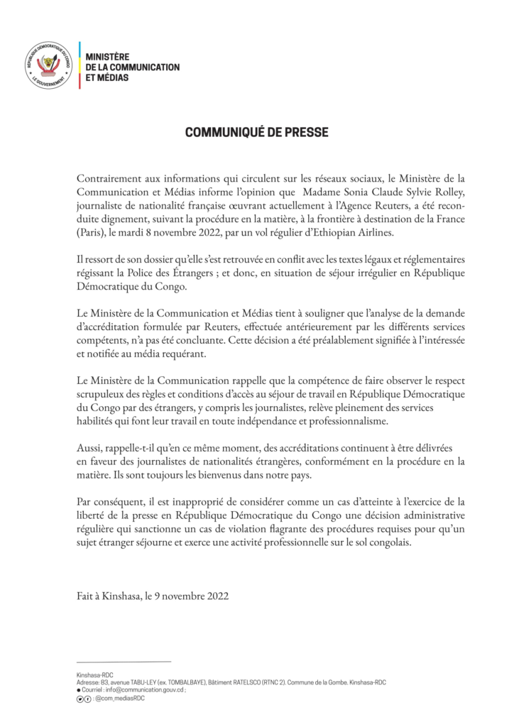 « Il ressort de son dossier qu’elle s’est retrouvée en conflit avec les textes légaux et réglementaires régissant la Police des étrangers ; et donc, en situation de séjour irrégulier en République Démocratique du Congo. L’analyse de la demande d’accréditation formulée par Reuters, effectuée antérieurement par les différents services compétents, n’a pas été concluante. Cette décision a été préalablement signifiée à l’intéressée et notifiée au média requérant. », peut-on lire dans ce communiqué.
