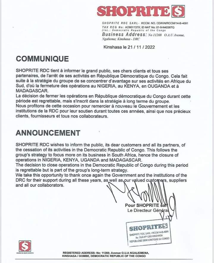 La chaîne de supermarchés sud-africaine Shoprite note que, « la décision de fermer les opérations en République démocratique du Congo durant cette période est regrettable, mais s’inscrit dans la stratégie à long terme du groupe ».