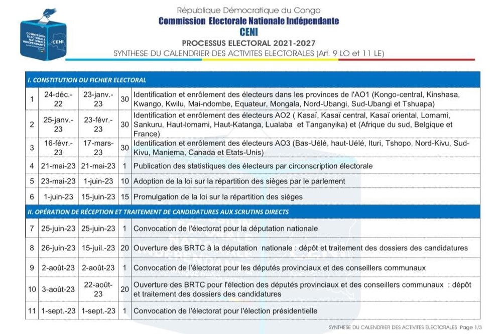 Le président de la Commission Électorale Nationale Indépendante (CENI), Dénis Kadima Kazadi vient de dévoiler ce samedi 26 novembre devant la presse, les représentants des partis et regroupements politiques, le calendrier électoral. En effet, le 20 décembre 2023 aura lieu les scrutins directs du Président de la République, des députés nationaux et provinciaux, et des conseillers communaux.