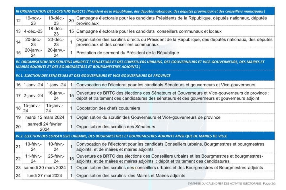 Cependant, la période allant du 19 novembre au 18 décembre 2023 sera réservée à la campagne électorale pour les candidats Présidents de la République, députés nationaux et provinciaux.