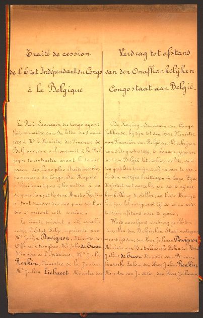 La première page du traité de cession rappelle que dès le 5 août 1889, le roi Léopold II avait proposé à la Belgique de contracter un accord pour « ses possessions du Congo ».