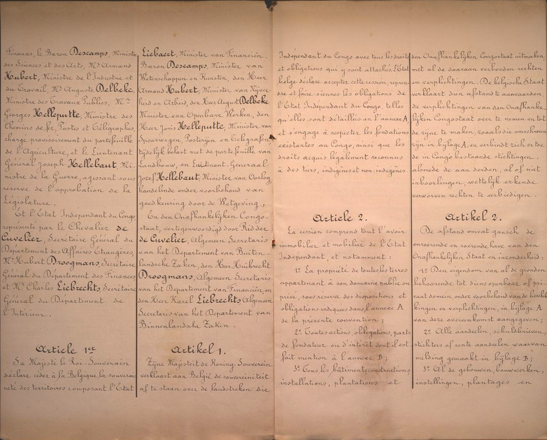 Le Traité cédant le Congo de Léopold II à la Belgique n’existait qu’en deux exemplaires. On peut y découvrir les engagements réciproques pris par le donateur, « l’Etat indépendant du Congo » (propriété de Léopold II) et par le gouvernement belge, représenté par les ministres de l’époque. Les deux exemplaires du Traité avaient au fil du temps « mystérieusement » disparu jusqu’à ce qu’un des exemplaires finisse par réapparaître dans une salle de vente.