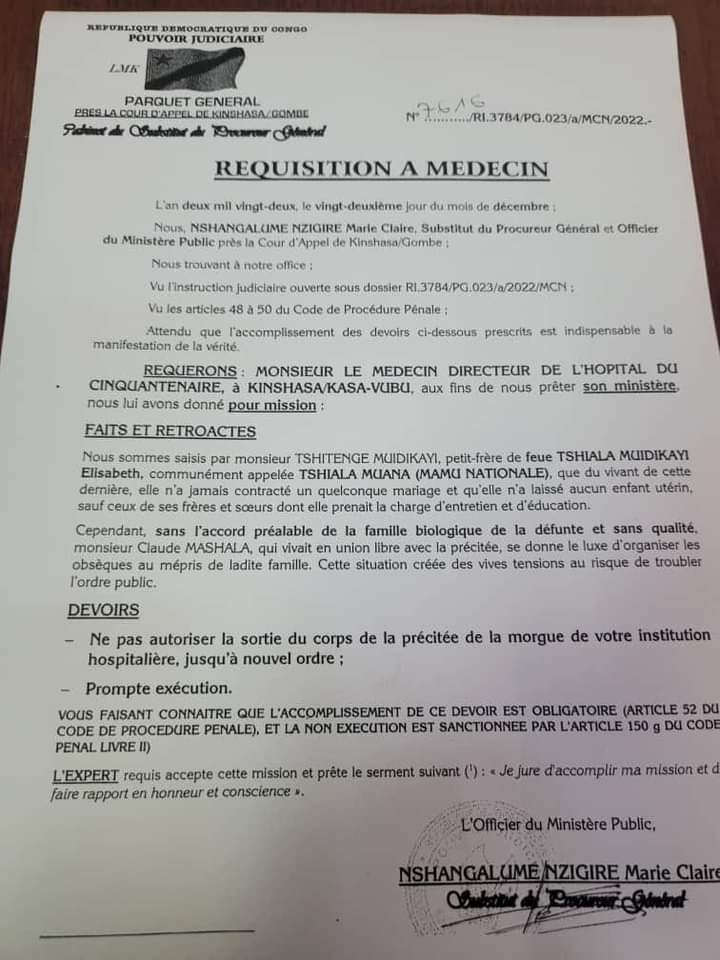 Le parquet a cependant enjoint à l’hôpital du cinquantenaire de ne pas autoriser la sortie du corps de Tshala Muidikayi Élisabeth dit Mamu Nationale.