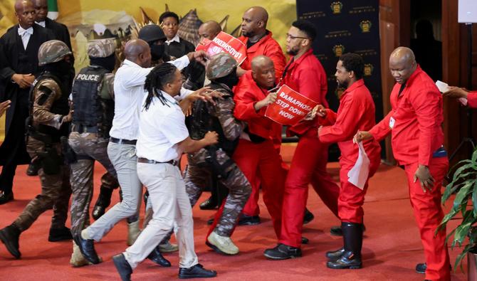 Jeudi soir au Cap, le président Ramaphosa a commencé à s’exprimer devant plusieurs centaines de députés, juges, anciens présidents et invités, dans une ambiance tendue. La cérémonie a été interrompue, à peine entamée, par des membres du parti radical de gauche EFF (Combattants pour la liberté économique), qui se sont précipités sur la tribune où se tenait M. Ramaphosa. Ils ont été exclus de la salle. Les responsables du mouvement avaient juré de ne pas laisser le président « délinquant » s’exprimer.