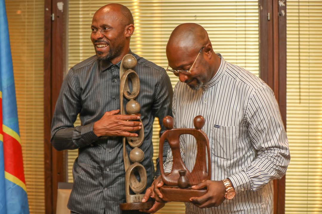 Le Ministre Muyaya a reçu une statue des mains du Directeur général de l’ACP, Bienvenu Bakumania, et pareil pour Jésus Noël Sheke qui l’a reçu des mains de Madame Sylvie Bongo.