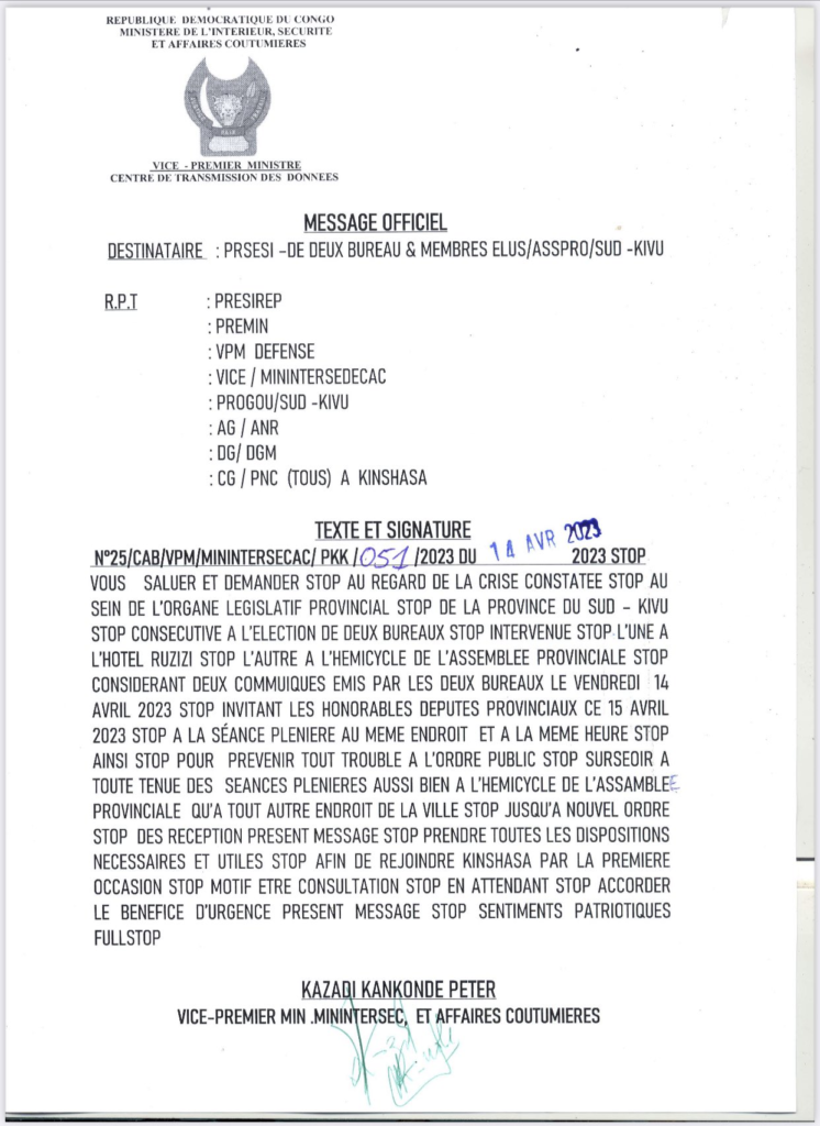 Dès réception dudit message, le Vice- Premier ministre demande au Bureau de l’Assemblée provinciale du Sud- Kivu de rejoindre Kinshasa pour consultations.