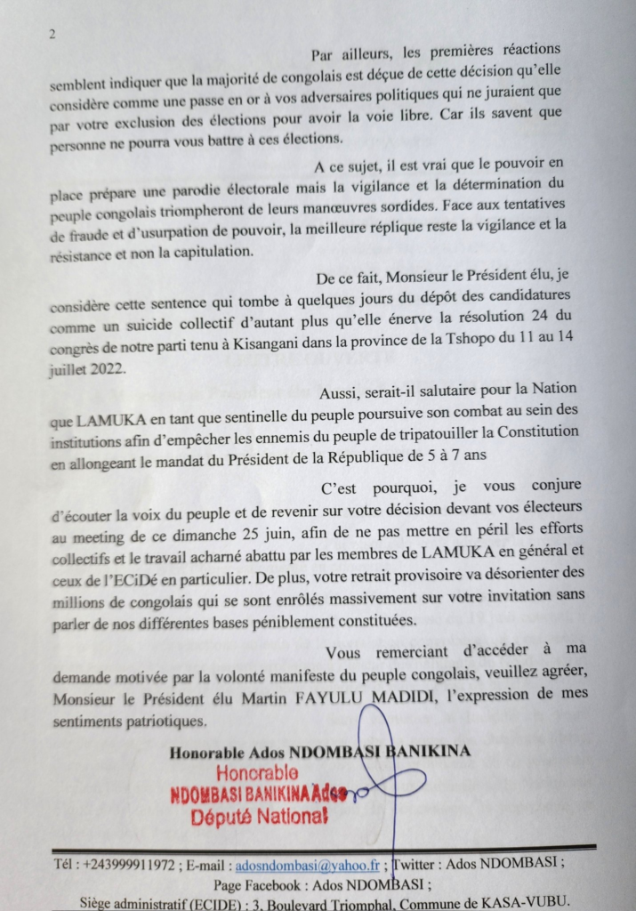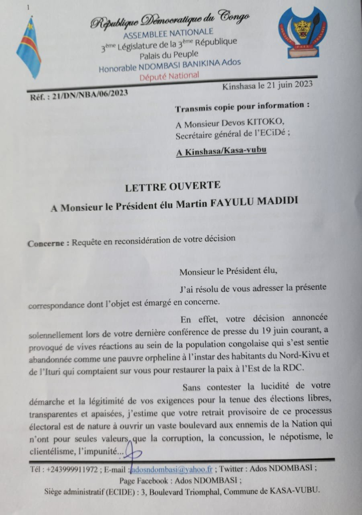 Dans une correspondance adressée ce mercredi 22 juin à son leader Martin Fayulu, le député national de l’Ecidé Ados Ndombasi demande au président national de son parti politique de reconsidérer sa décision de retrait provisoire du processus électoral.