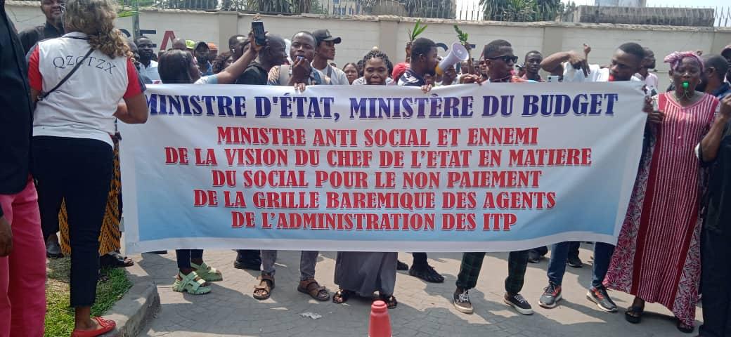 L’on peut apercevoir des écrits sur des banderoles avec des messages à l’endroit du ministre réclamant une suite favorable d’ici le prochain trimestre.