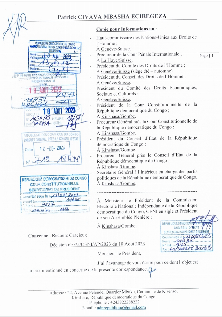 Dans une correspondance adressée à la CENI ce vendredi 18 août, un citoyen congolais, Patrick Civava Mbasha Ecibegeza invite Dénis Kadima a rejeté des listes du parti UDPS lors de la publication définitive des candidatures retenues pour législatives nationales prévues au mois de décembre de l’année en cours.