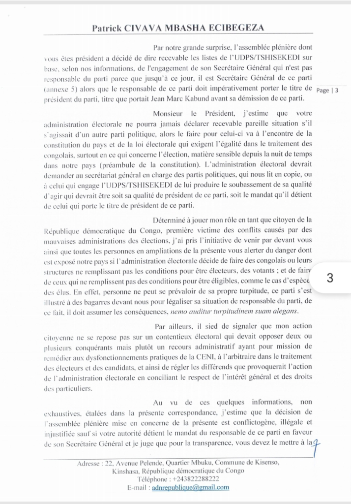 Cependant, souligne-t-il, “Par notre grande surprise, l’assemblée plénière dont êtes président a décidé de dire recevable les listes de I’UDPS/TSHISEKEDI sur base, selon nos informations, de l’engagement de son Secrétaire Général qui n’est pas responsable de ce parti parce que jusqu’à ce jour, il est Secrétaire Général de ce parti (annexe 5) alors que le responsable de ce parti doit impérativement porter le titre de président du parti, titre que portait Jean Marc Kabuncl avant sa démission de ce parti”, a-t-il expliqué.