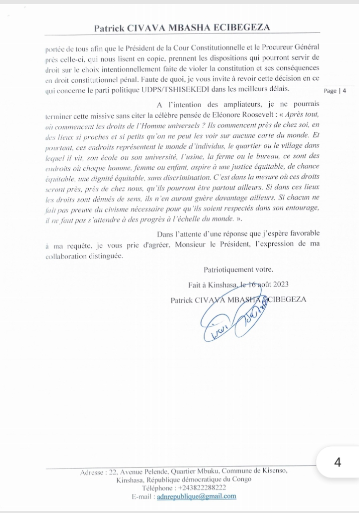 ” En observant les listes en annexe de la décision précitée (annexe 3), j’ai remarqué la présence du parti politique Union pour la démocratie et Progrès Social/Tshisekedi (UDPS/TSHISEKEDI), parti politique dont le responsable est Monsieur Felix TSHISEKEDI TSHILOMBO en vertu de la liste des partis politiques autorisés à fonctionner en République démocratique du Congo confectionnée par le secrétariat général aux relations avec les partis politiques, service technique à titré pour ce faire et vous transmis par le Vice Premier Ministre, Ministre de l’Intérieur, Sécurité et AlTaires Coutumières, in tempore non suspecto, en date du 23 juin 2023 (annexe 4) et surtout en vertu de ses statuts, qui dans son article 23, fait du président de ce parti, le responsable de celui-ci. Mes sources me renseignent que des documents aurait été fabriqué et antidaté mais l’administration est là aussi pour déceler les faux, le crime parfait n’existant pas, et les sanctionner, fraus omnia corrupti”.