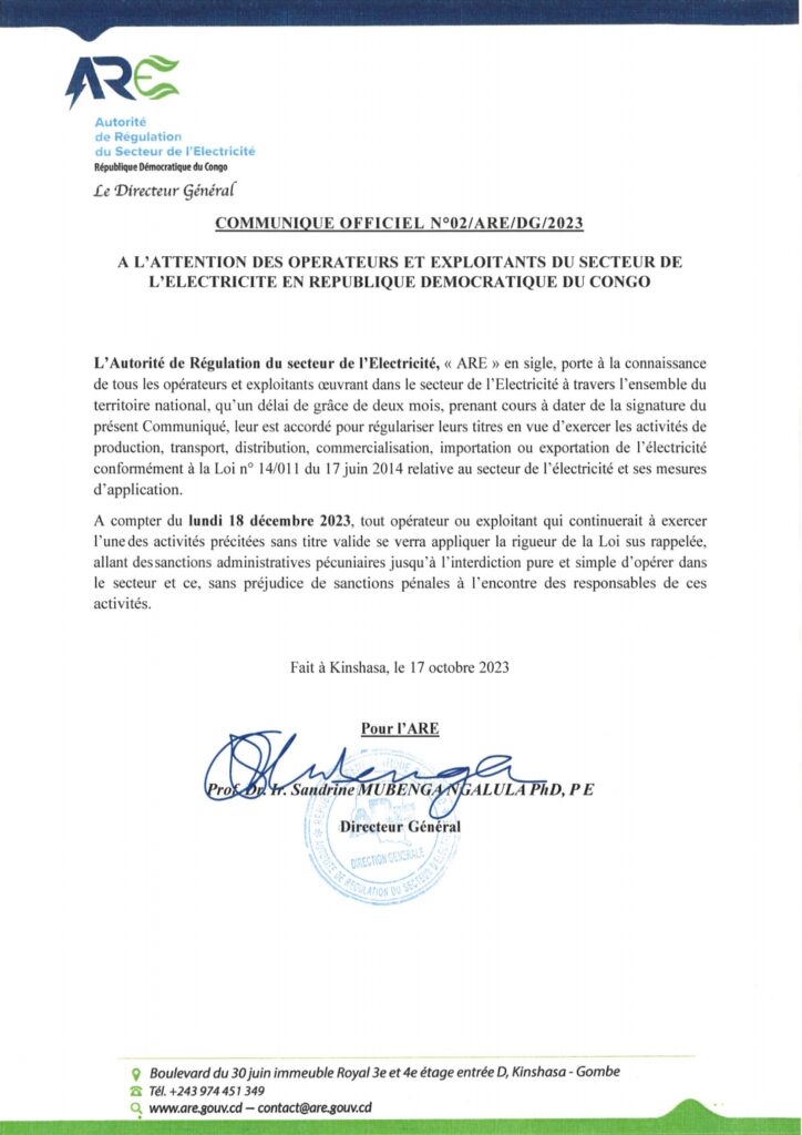 L’autorité de régulation du secteur de l’électricité (ARE) a, à travers un communiqué, accordé un délai de deux mois à tous les opérateurs et exploitants œuvrant dans le secteur de l’électricité en République Démocratique du Congo pour régulariser leurs titres.
