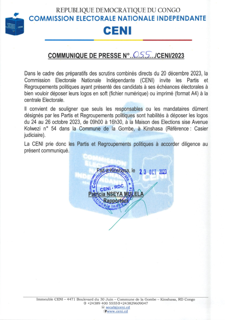 C’est dans cette logique qu’elle a, à travers un communiqué de presse rendu public ce lundi 23 octobre, dont une copie est parvenue à la rédaction de Objectif-Infos.cd, invité les partis et regroupements politiques ayant présenté des candidats aux échéances électorales à venir, à bien vouloir déposer à la Centrale électorale, leurs logos en soft (fichier numérique) ou imprimé (format A4); en date du 24 au 26 octobre.