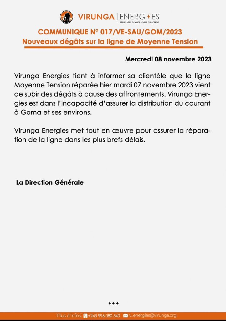 Agression rwandaise : Encore une coupure d’électricité à Goma et ses environs suite aux affrontements ( Communiqué)