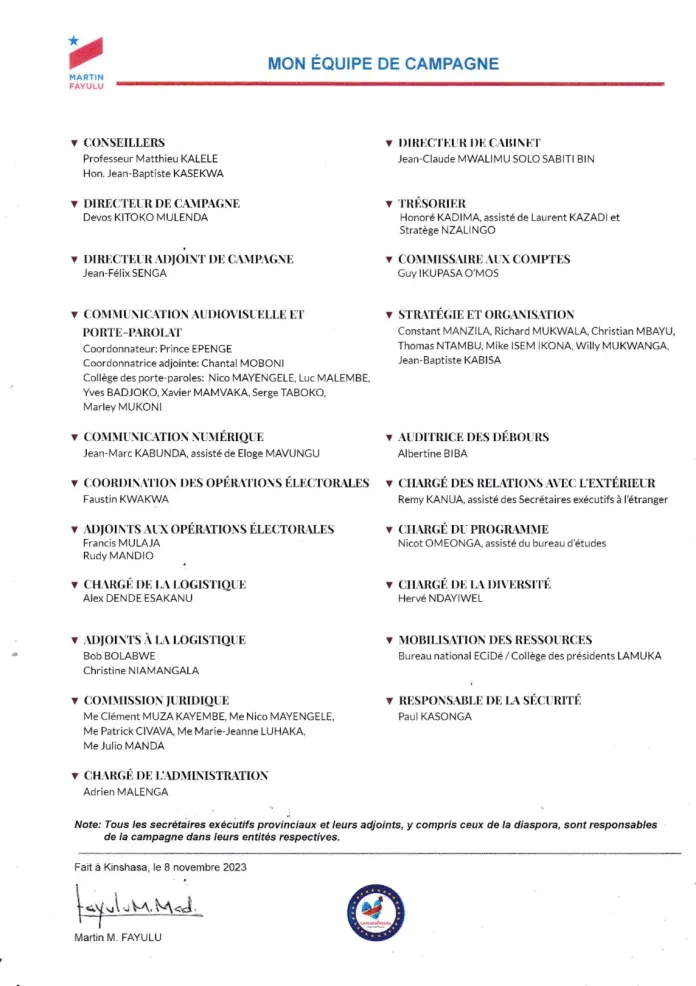 Le candidat à la présidentielle de décembre 2023, Martin Fayulu Madidi a, dans sa décision signée ce mercredi 08 novembre, désigné Devos Kitoko comme son directeur de campagne et Jean-Félix Senga comme adjoint.