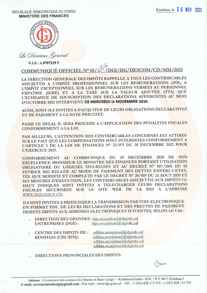 La Direction Générale des Impôts (DGI) informe tous les assujettis à l’impôt professionnel sur les rémunérations (IPR), à l’impôt exceptionnel sur les rémunérations versées au personnel expatrié (IERE) et à la Taxe sur la valeur ajoutée (TVA) que l’échéance des souscriptions afférentes au mois d’octobre 2023 intervient ce mercredi 15 novembre 2023.