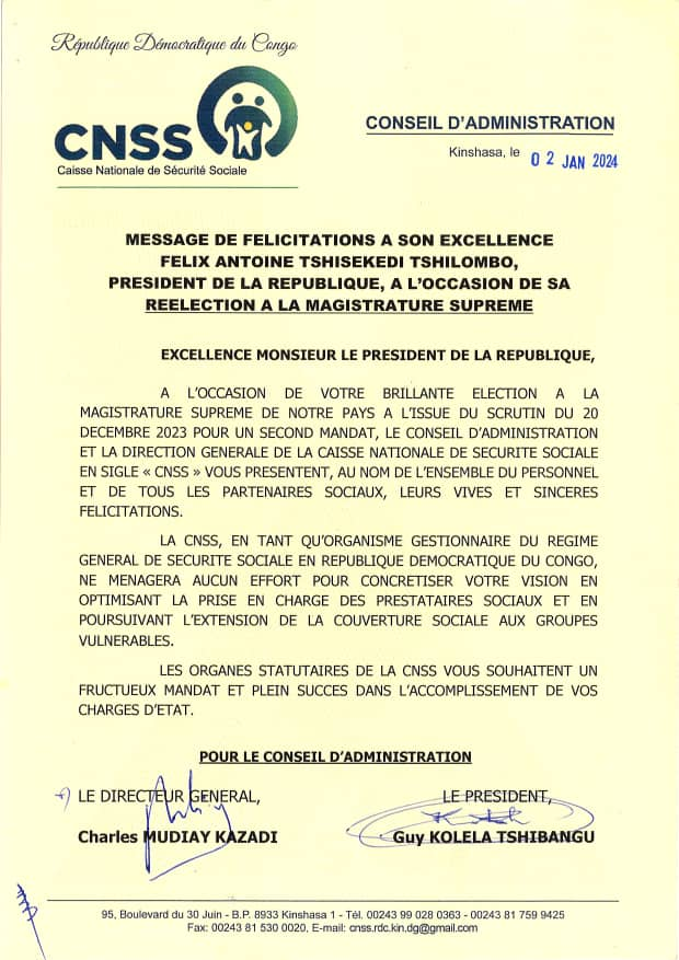 Les messages de félicitations fusent de partout après la réélection de Félix Tshisekedi pour un deuxième mandat à la tête du pays. Le dernier en date est celui de la Caisse Nationale de Sécurité Sociale, CNSS.