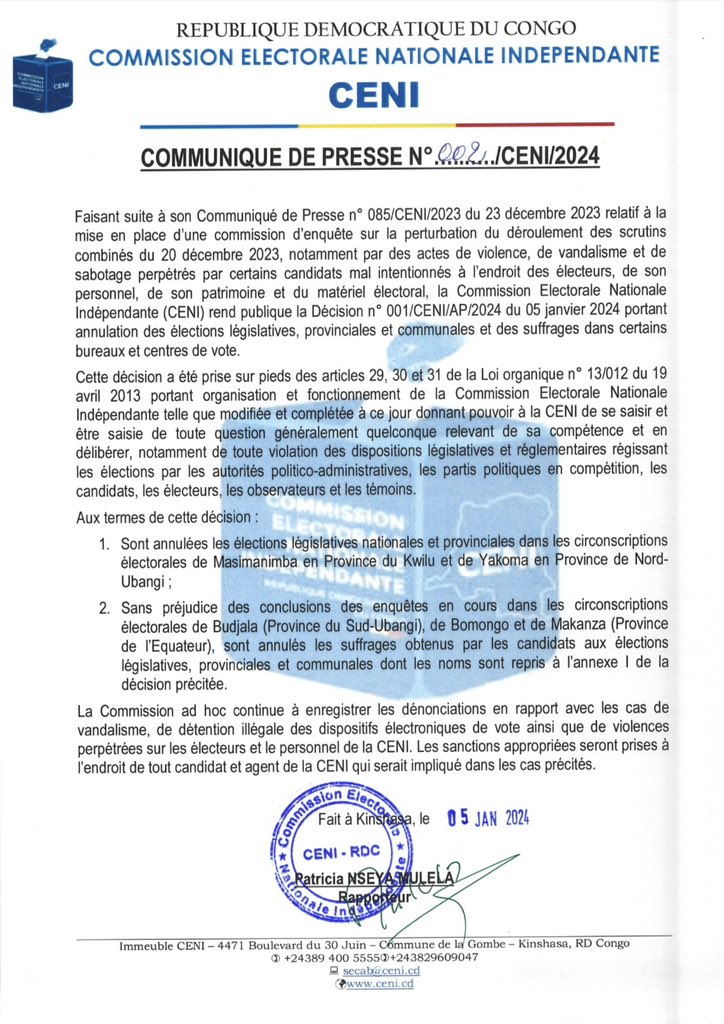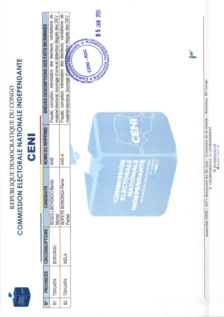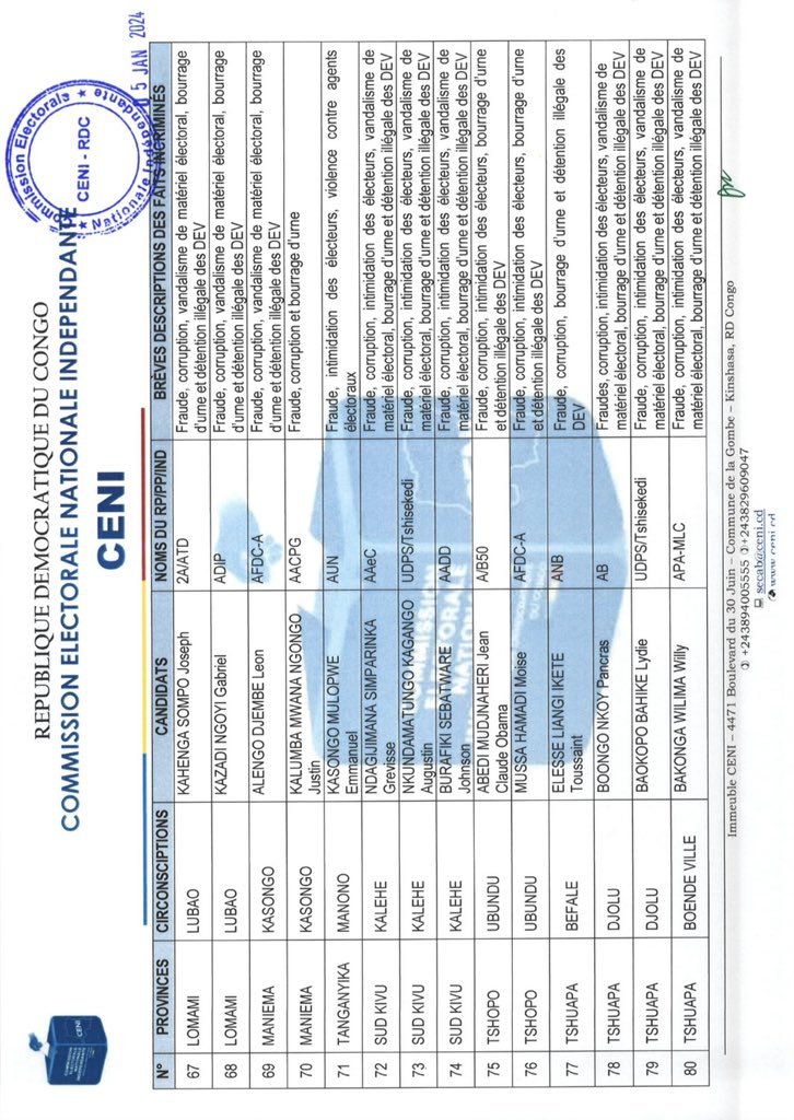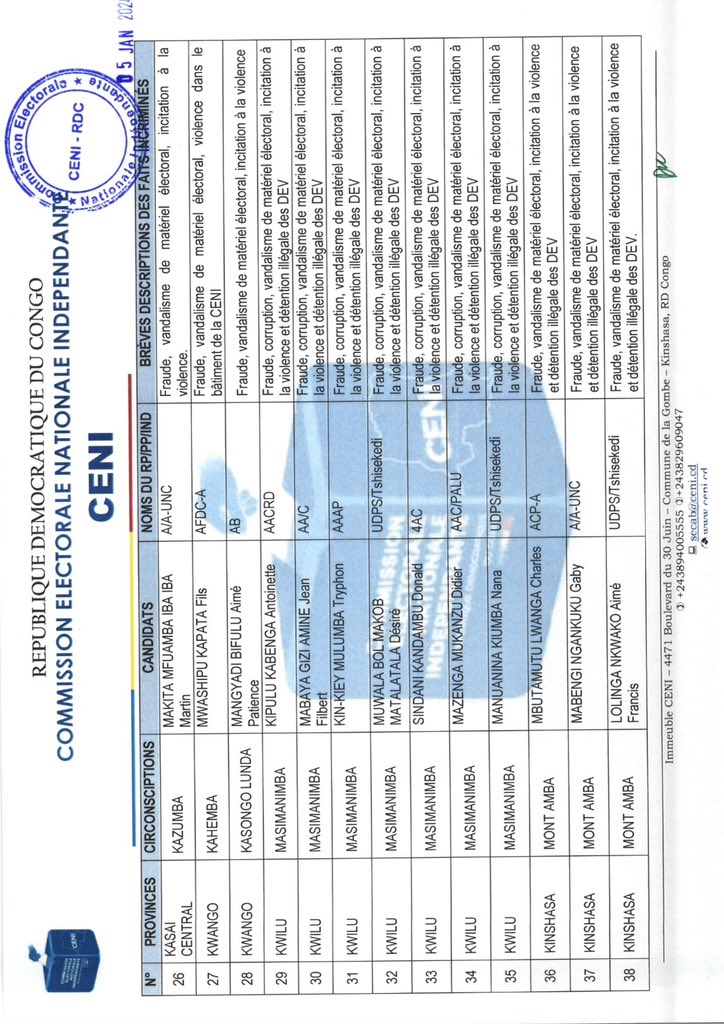 Ces candidats des différentes circonscriptions sont accusés de « fraude fiscale, corruption, vandalisme du materiel électoral de la CENI , intimidation des électeurs , détention illégale de DEV ( machine à voter) , bourrage d’urnes ».
