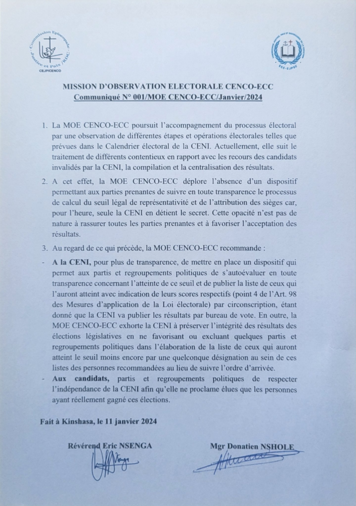 En effet par un communiqué, la Mission d’Observation Électorale (MOE) CENCO-ECC exprime son indignation sur le déroulement du processus de calcul du seuil légal de représentativité et l’attribution des sièges dont les parties prenantes n’ont pas suivi dans la transparence.