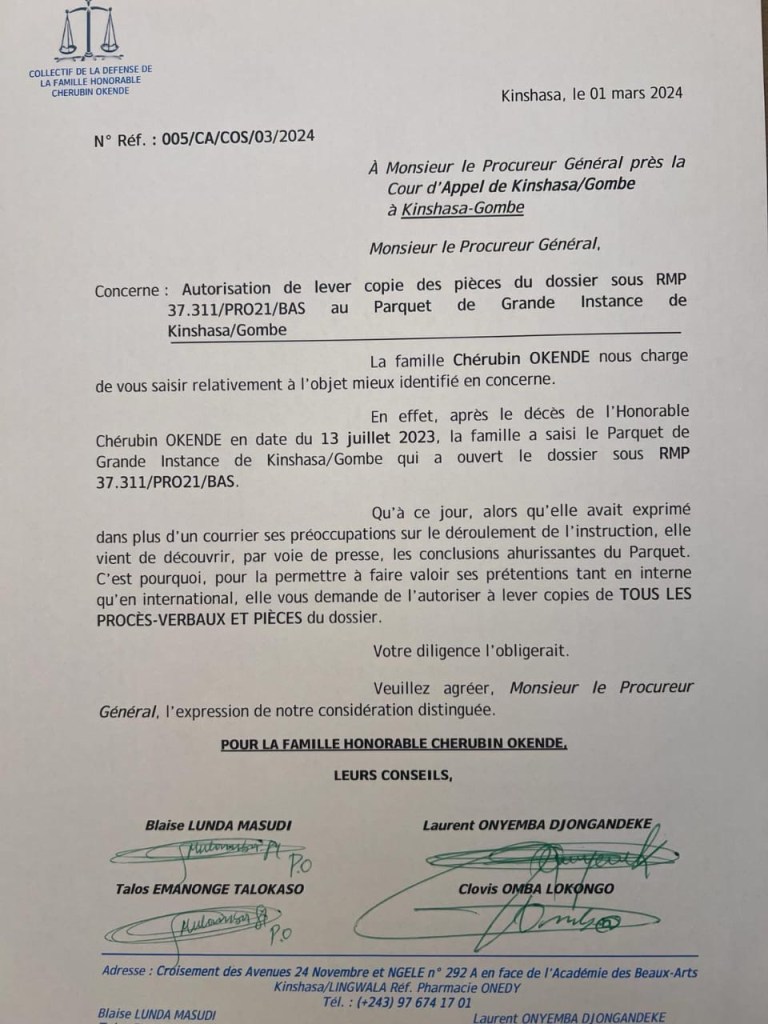 Dans une correspondance adressée, ce vendredi 1er mars, au procureur général près la Cour d’appel de Kinshasa/Gombe, la famille de l’ancien ministre des Transports, Chérubin Okende,k à travers ses avocats, demande au procureur général de la Cour d’appel de Kinshasa/Gombe de l’autoriser à lever copies de toutes les pièces.