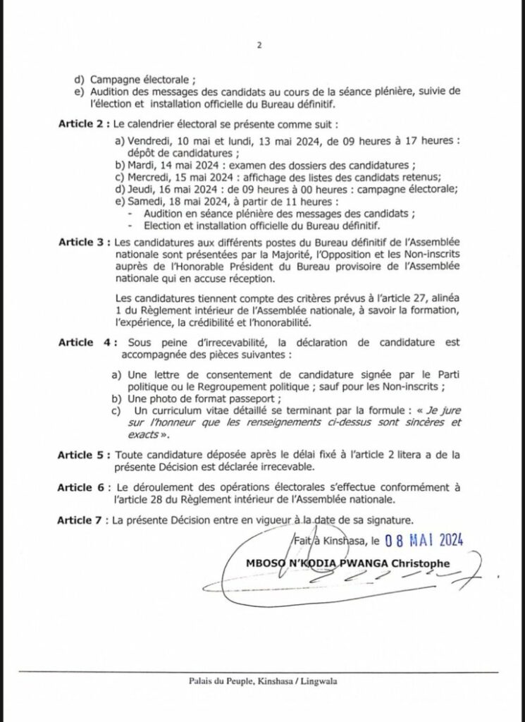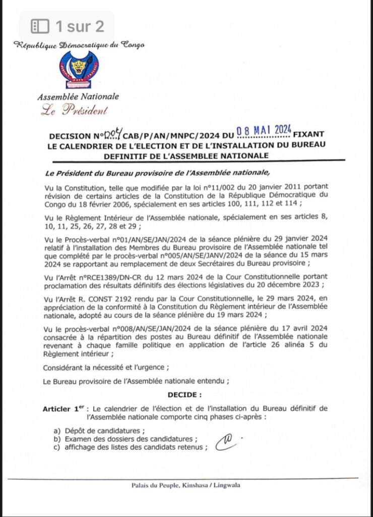 Après plusieurs tractations, le président du bureau d’âge de l’Assemblée nationale, Christophe Mboso, a dévoilé le calendrier réaménagé de l’élection du bureau définitif de cette chambre basse du Parlement.