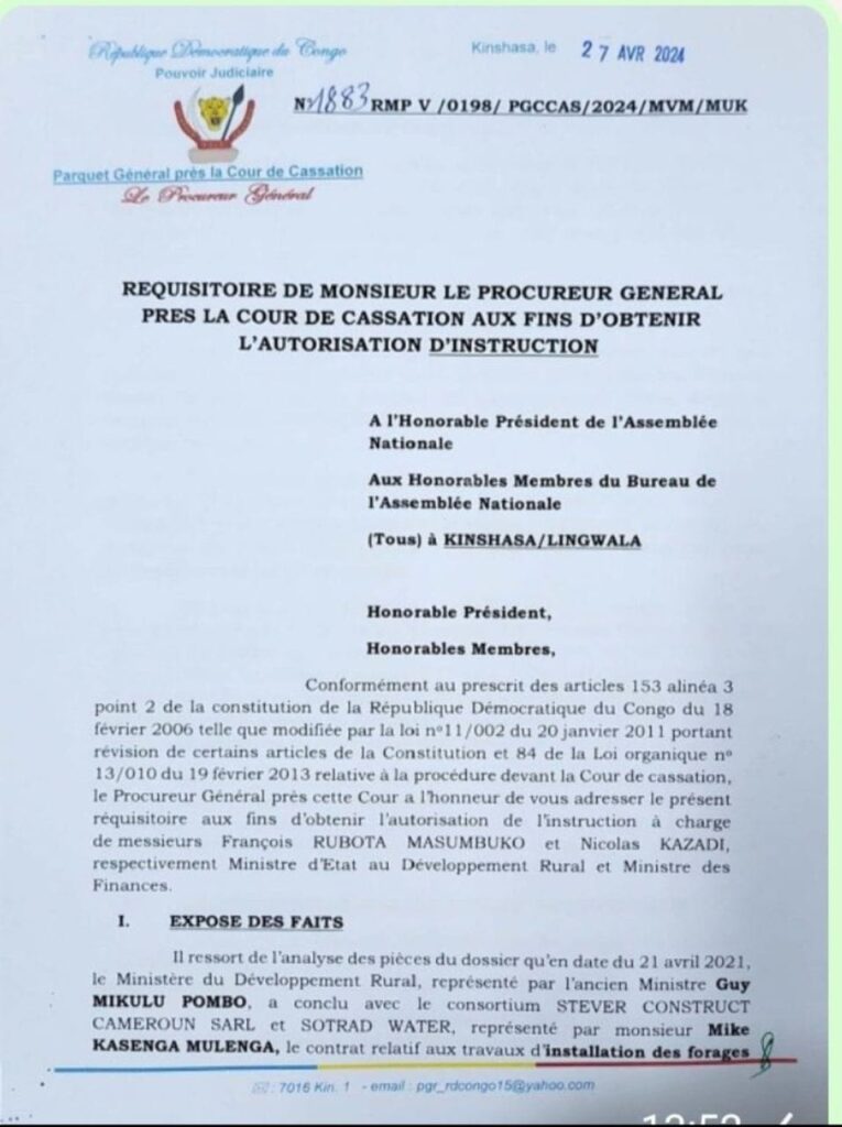 Les personnalités citées ci-haut sont soupçonnées de s’impliquer dans la surfacturation dans le cadre d’un marché public consistant à la construction des stations de traitement et distribution d’eau dans différentes provinces de la République Démocratique du Congo.