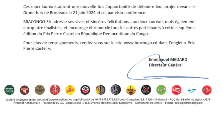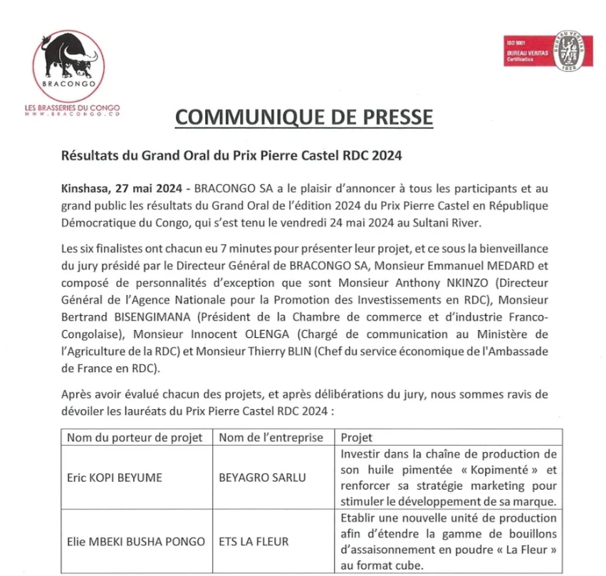 Les six finalistes au « Prix Pierre Castel RDC 2024 » ont défendu leurs projets le vendredi 24 mai devant un jury présidé par Emmanuel Médard, directeur général de BRACONGO SA. Selon le communiqué de ce lundi 27 mai, deux participants ont été proclamés lauréats de ce concours. Il s’agit de Éric Kopi Beyume et Elie Mbeki Busha Pongo. Le Communiqué, ci-dessous de BRACONGO SA, revient sur la nature des projets présentés par ces lauréats et sur les prochaines étapes après cette finale de la 5e édition du Prix Pierre Castel RDC 2024.