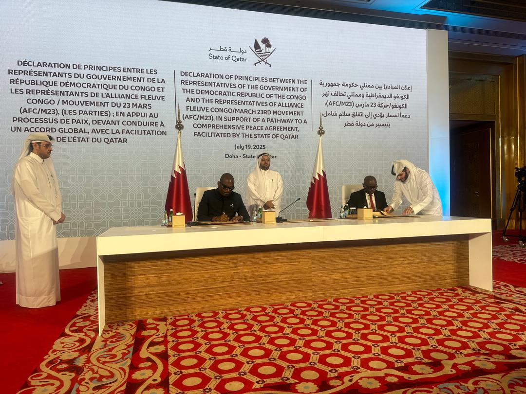 Dans le prolongement de l’accord de Washington conclu entre la RDC et le Rwanda, les délégations gouvernementales congolaises et les représentants de la rébellion M23/AFC ont signé ce samedi à Doha une déclaration de principes visant à établir les bases d’un accord de paix définitif pour l’Est de la RDC. Cette signature intervient après trois mois de négociations intensives facilitées par l’État du Qatar.