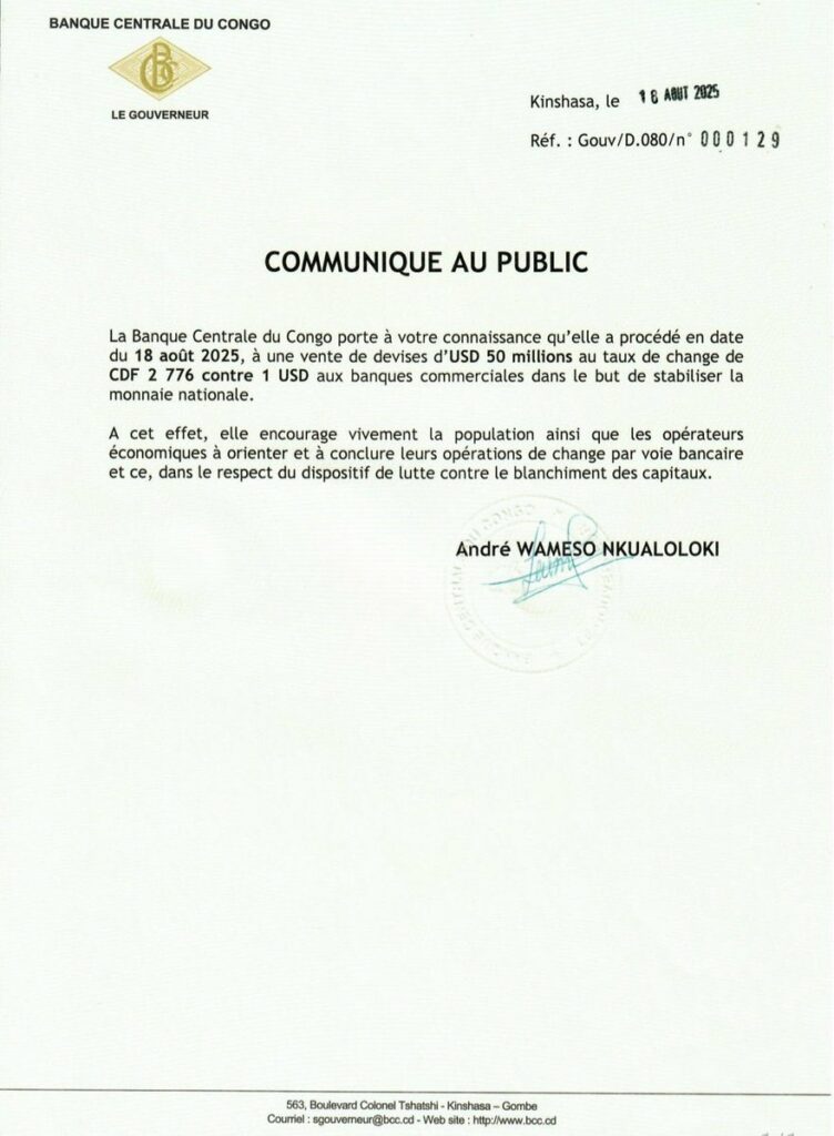 Face à la pression persistante sur le franc congolais, la Banque centrale du Congo (BCC) a procédé à une intervention significative sur le marché des changes. Le 16 août 2025, l’institution dirigée par Malangu André Wameso Nkualoloki a annoncé avoir vendu 50 millions de dollars américains à des banques commerciales au taux de 2 776 francs congolais pour 1 dollar.