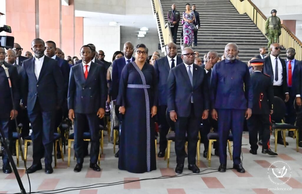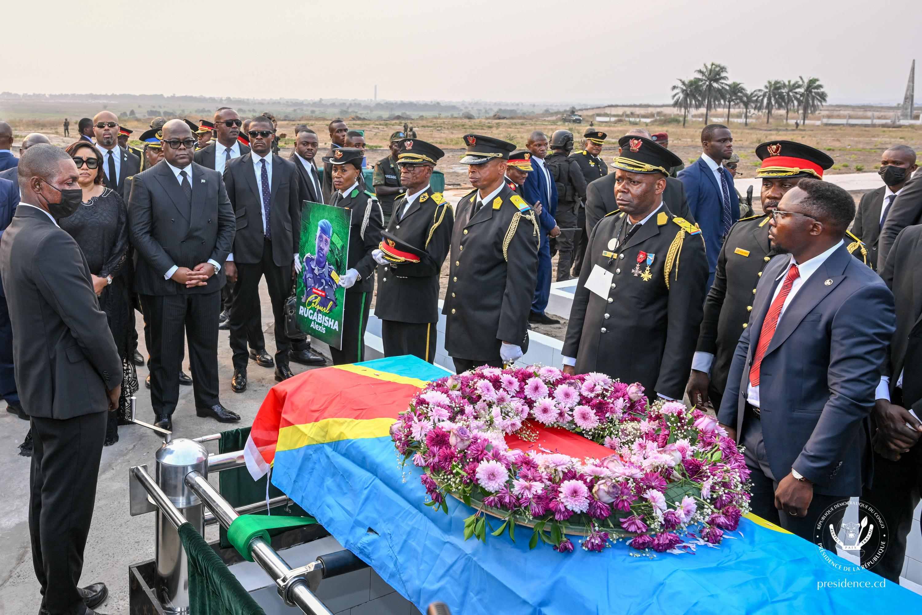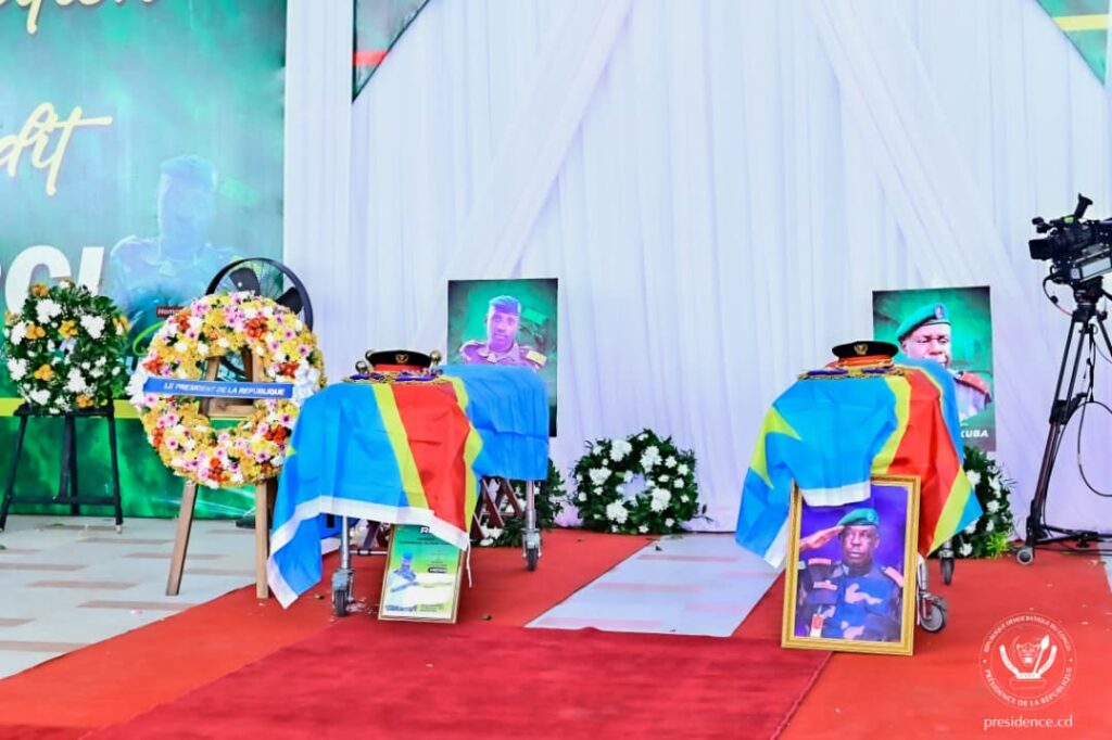 En présence des chefs des institutions, des membres du Gouvernement, des officiers généraux et supérieurs des FARDC ainsi que des membres de famille des illustres disparus, le Président de la République Félix Tshisekedi, accompagné de la distinguée Première Dame Denise Nyakeru, s’est incliné devant les deux cercueils couverts du drapeau national.