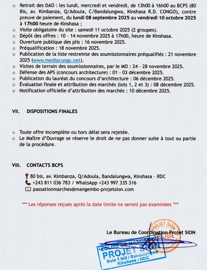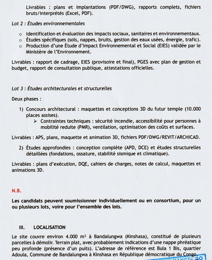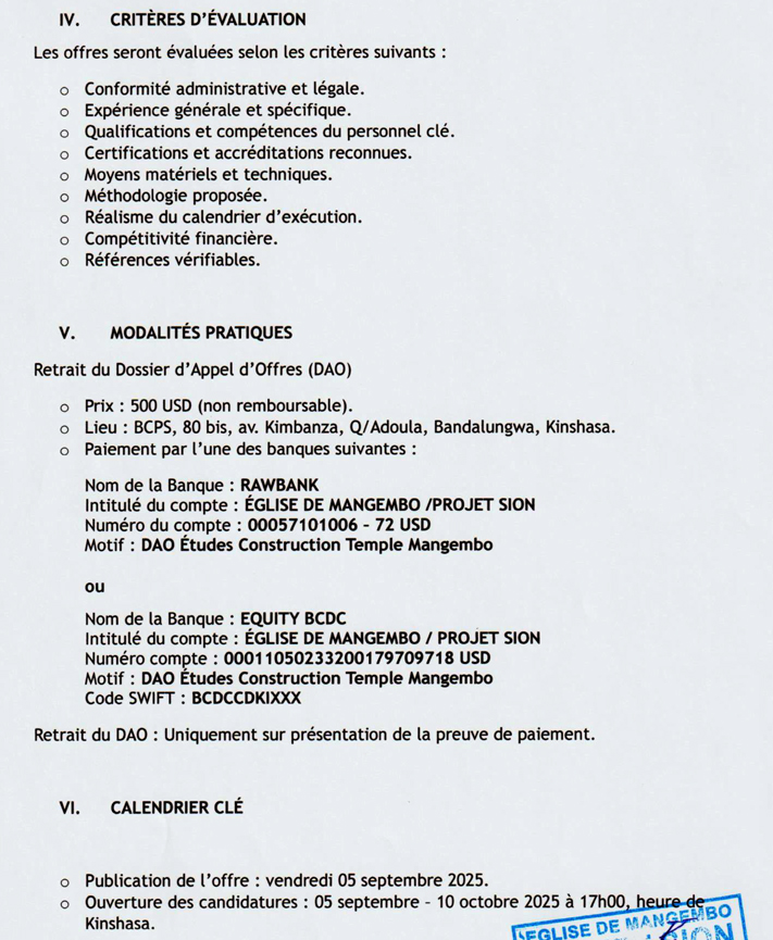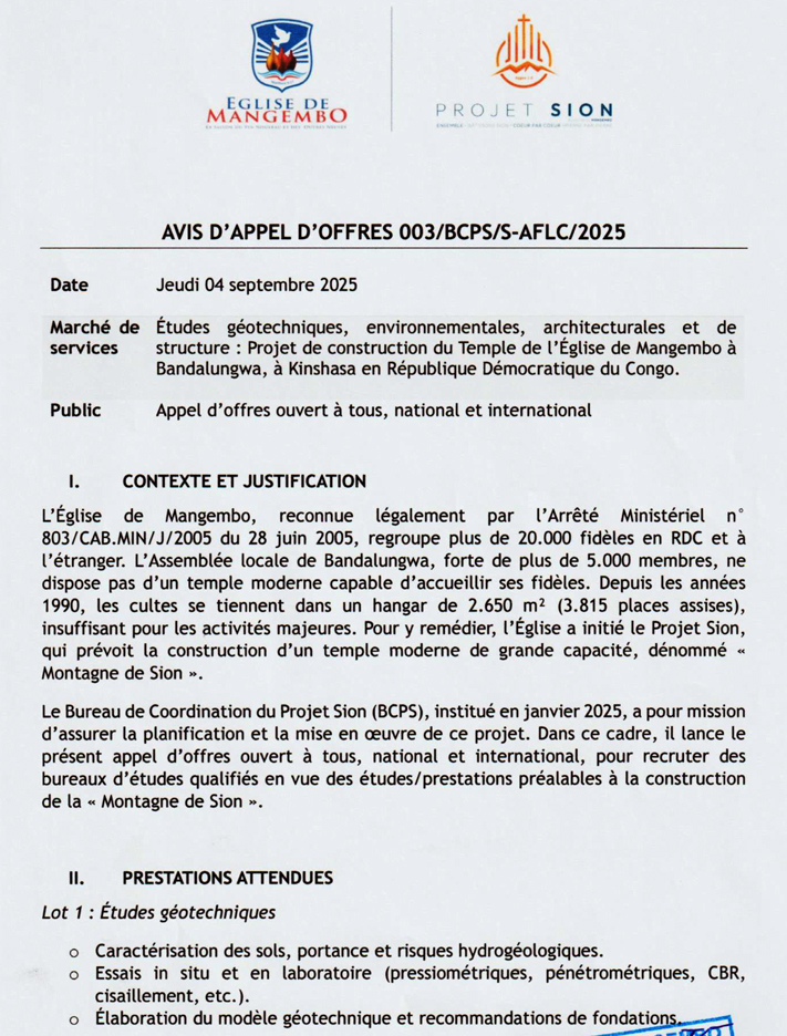 Intitulé de l’Offre | APPEL A MANIFESTATION D’INTÉRÊT AU PROJET DE CONSTRUCTION DU TEMPLE DE L’EGLISE DE MANGEMBO |