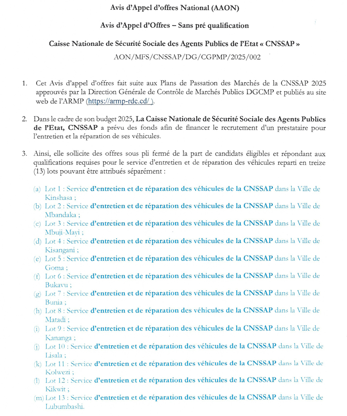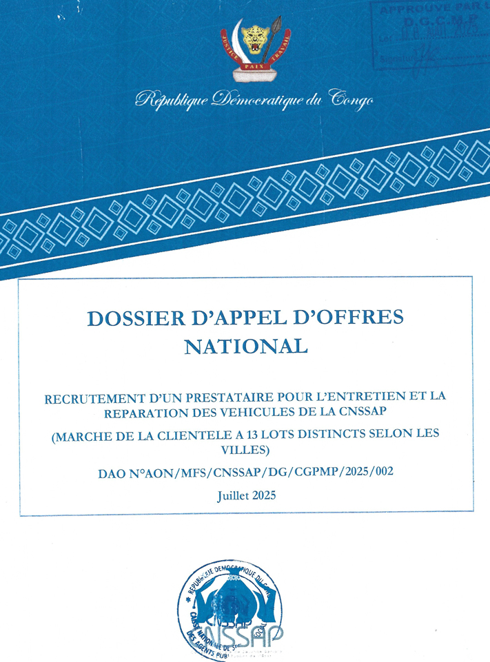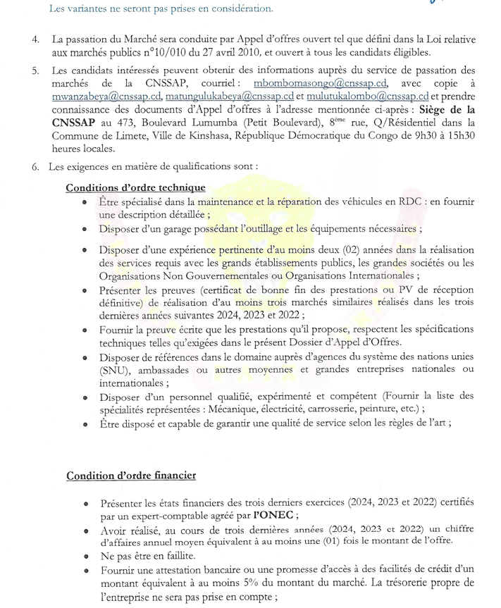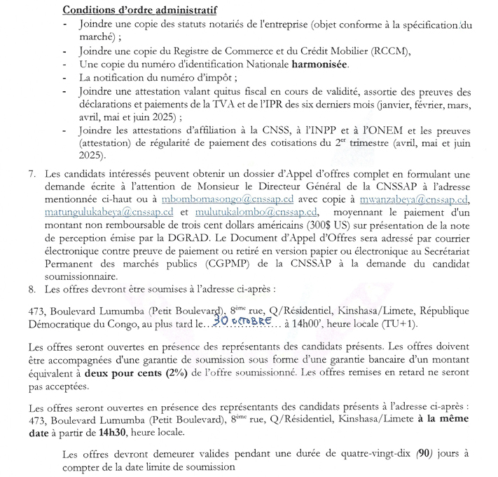 Adresse e-mail pour soumissionner | mbombomasongo@cnssap.cd mwanzabeya@cnssap.cd matungulukabeya@cnssap.cd mulutukalombo@cnssaap.cd |