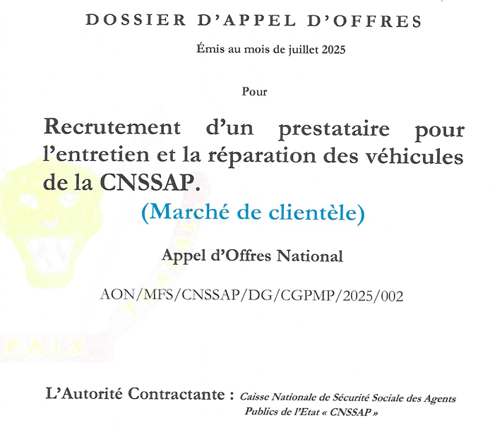 Intitulé de l’Offre | PRESTATAIRE POUR L’ENTRETIEN ET LA REPARATION DES VEHICULES DE LA CNSSAP (MARCHE DE LA CLIENTELE A & » LOTS DISTINCTS SELON LES VILLES) |