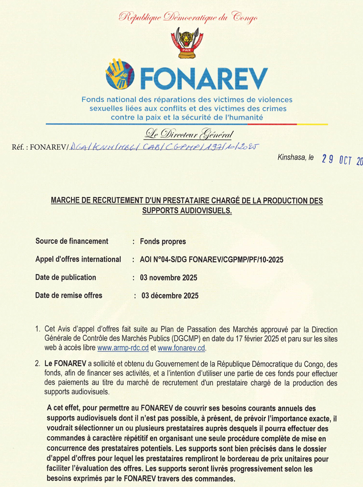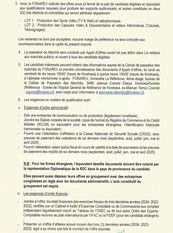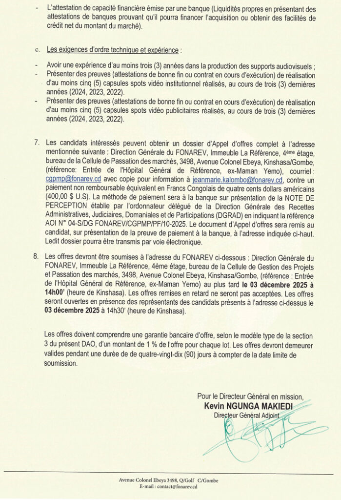 | Adresse e-mail pour soumissionner | cgpmp@fonarev.cd |