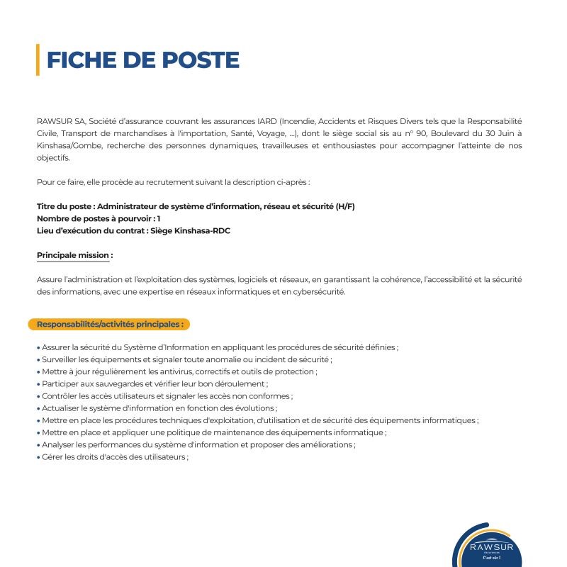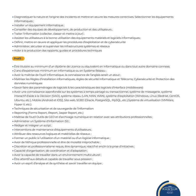 NUMERO DE REFERENCE :| Intitulé du poste | ADMINISTRATEUR DE SYSTÈME D’INFORMATION, RESEAU ET SECURITE (H :F) | |