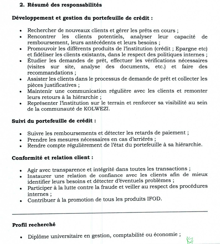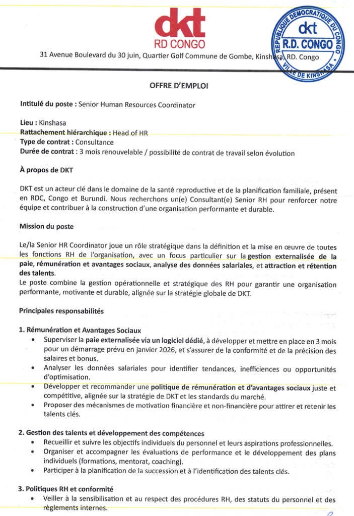 - Connaissance et maitrise des langues locales (Swahili, kikongo, lingala, tchiluba)