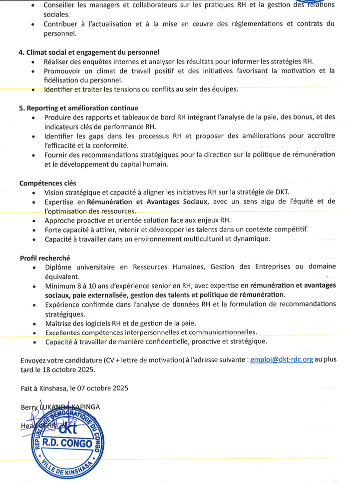 l’adresse email pour postuler | emploi@dkt-rdc.org |