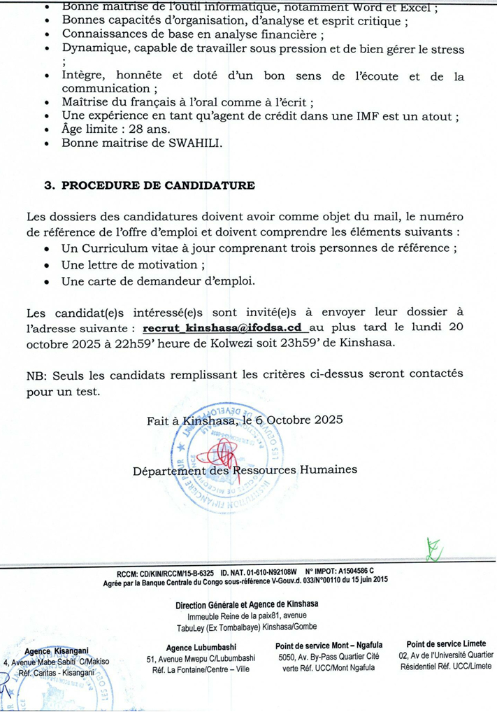 l’adresse email pour postuler | Recrut_kinshasa@ifodsa.cd |