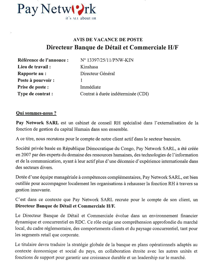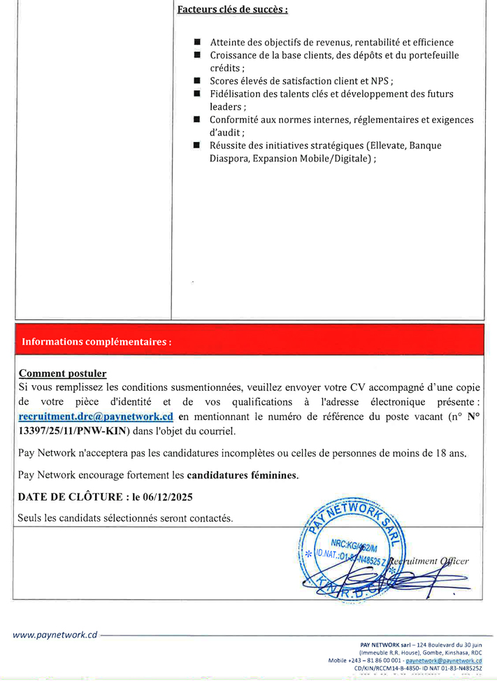 | l’adresse email pour postuler | Recruitment.drc@paynetwork.cd |