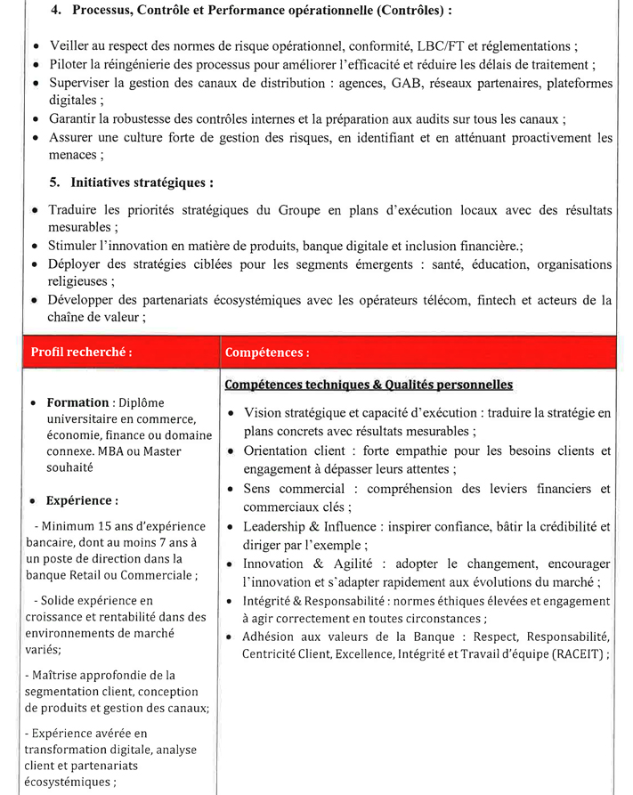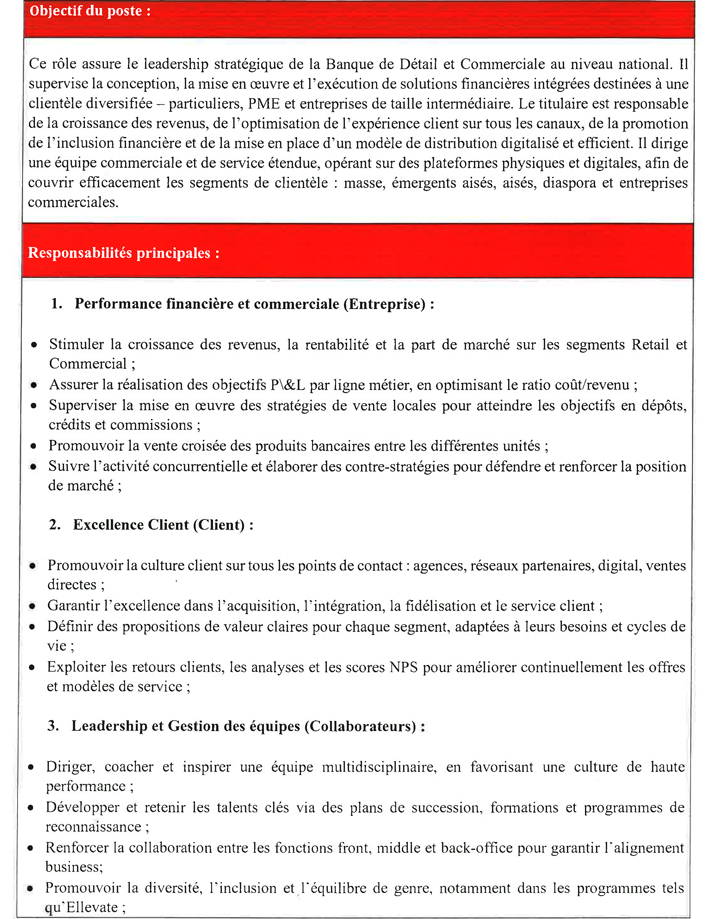 | Intitulé du poste | DIRECTEUR BANQUE DE DETAIL ET COMMERCIALE | |