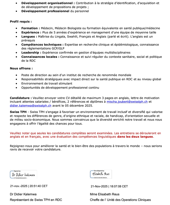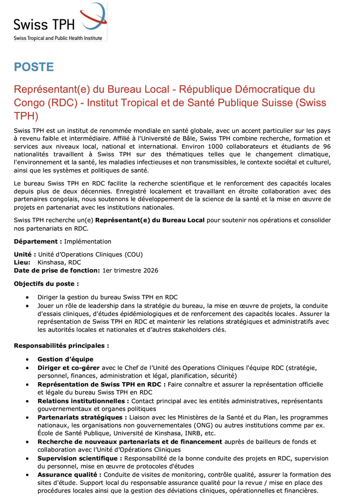 | l’adresse email pour postuler | Mischa.joubert@swisstph.cd didier.kalemwa@swisstph.ch |