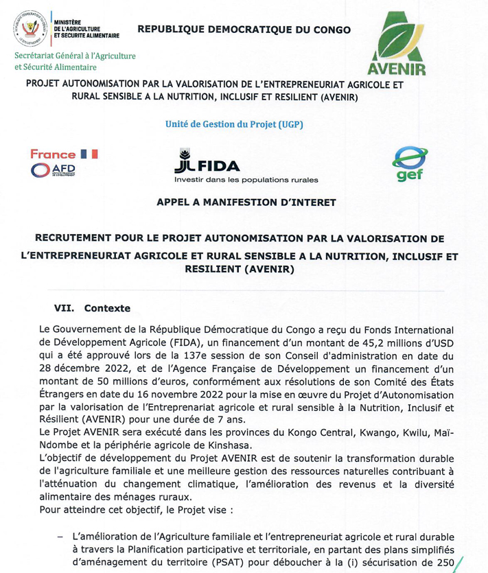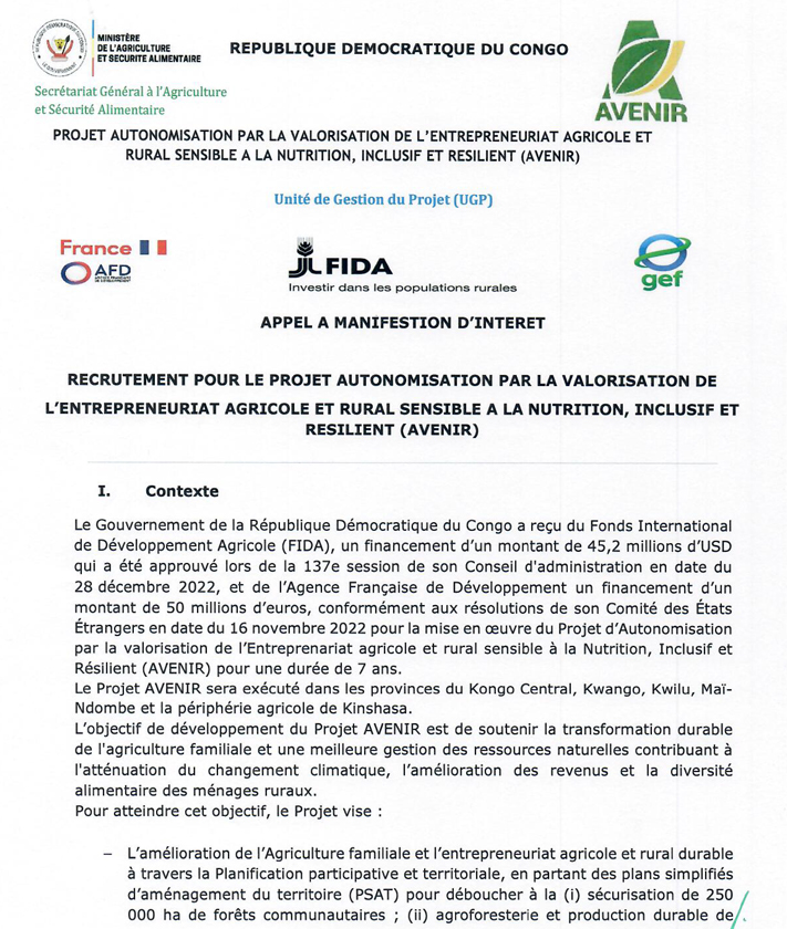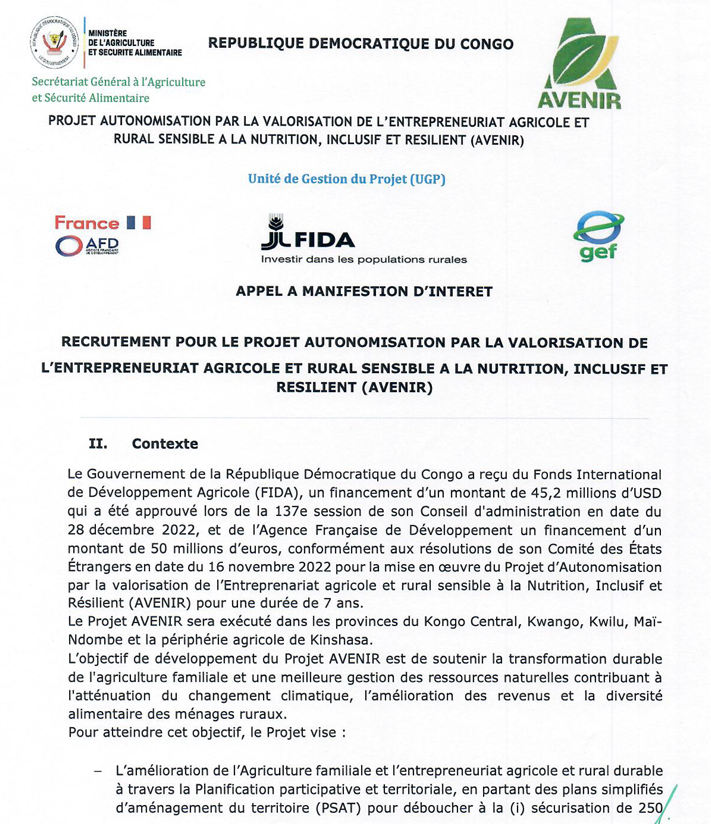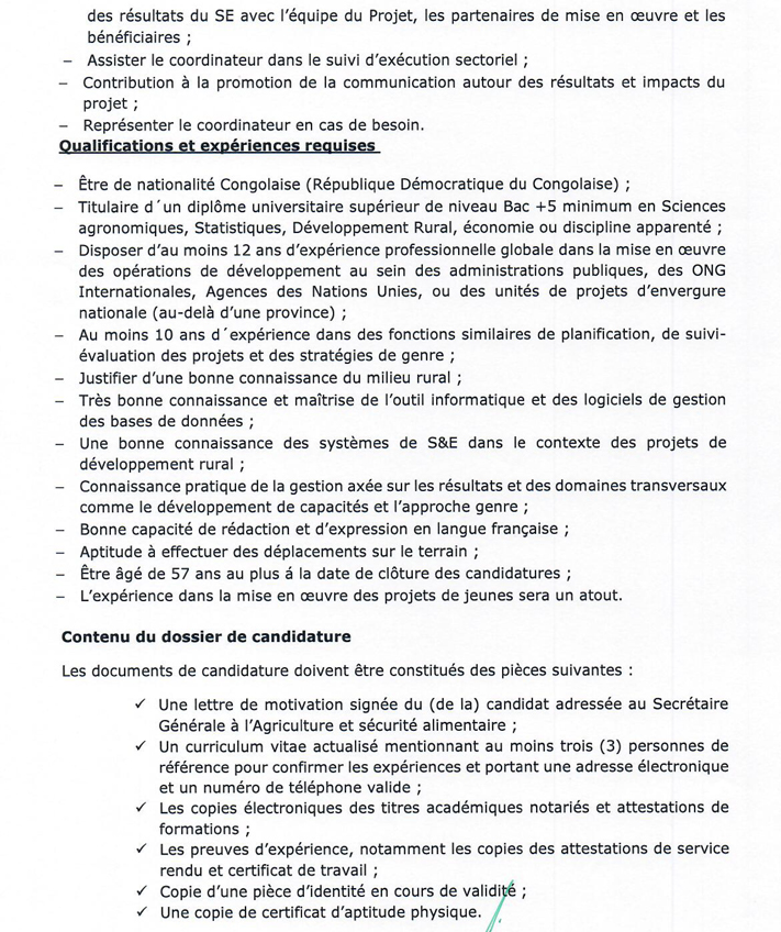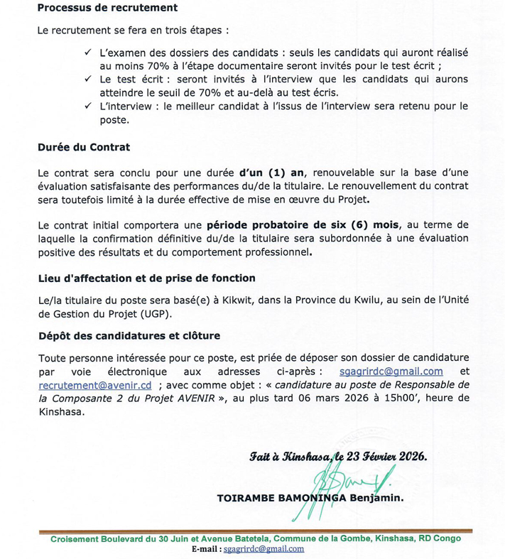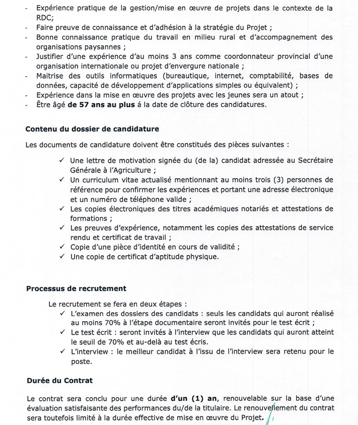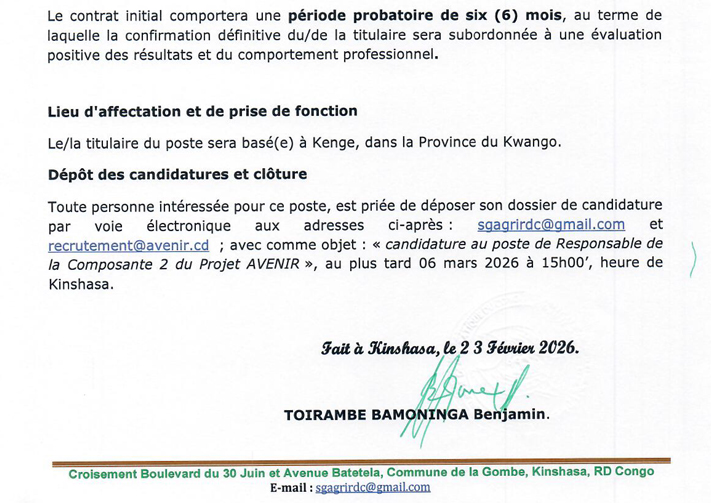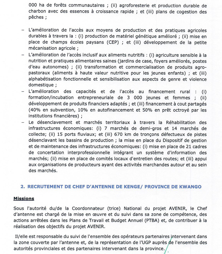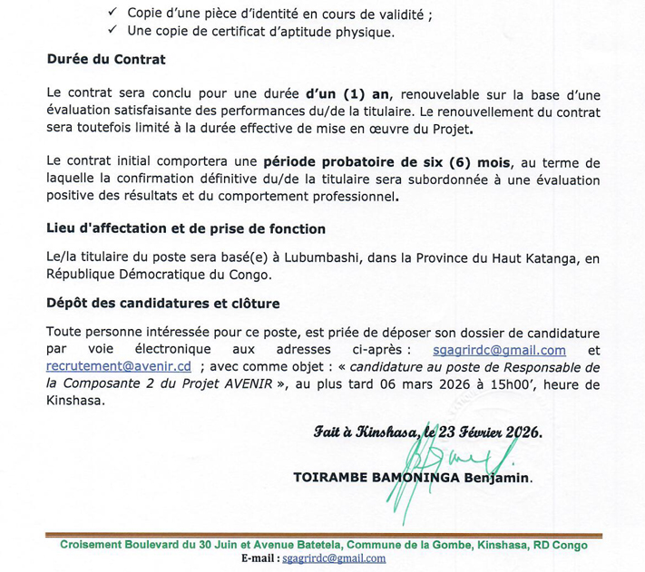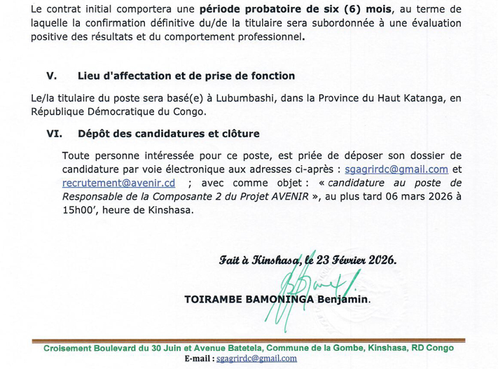 | l’adresse email pour postuler | sgagrirdc@gmail.com recrutement@avenir.cd |