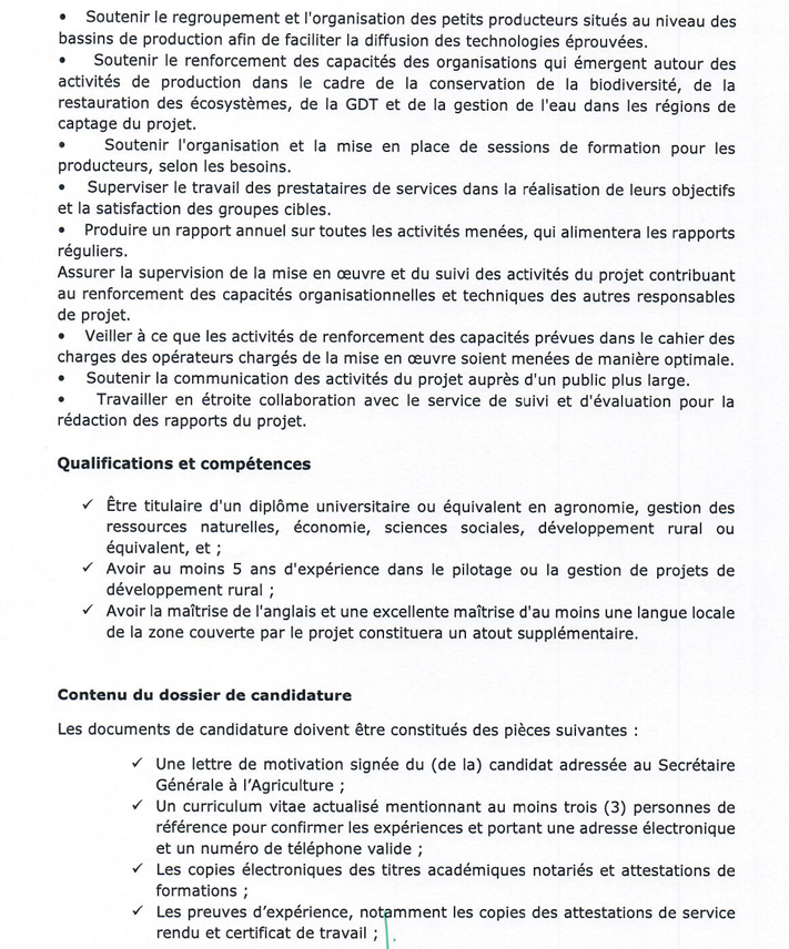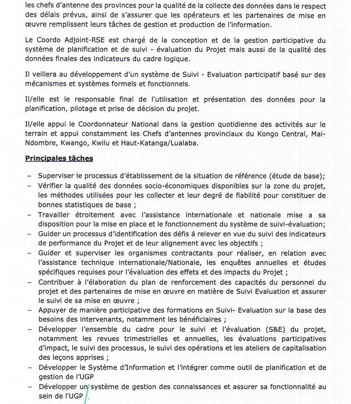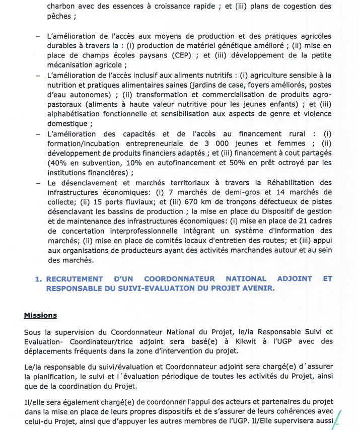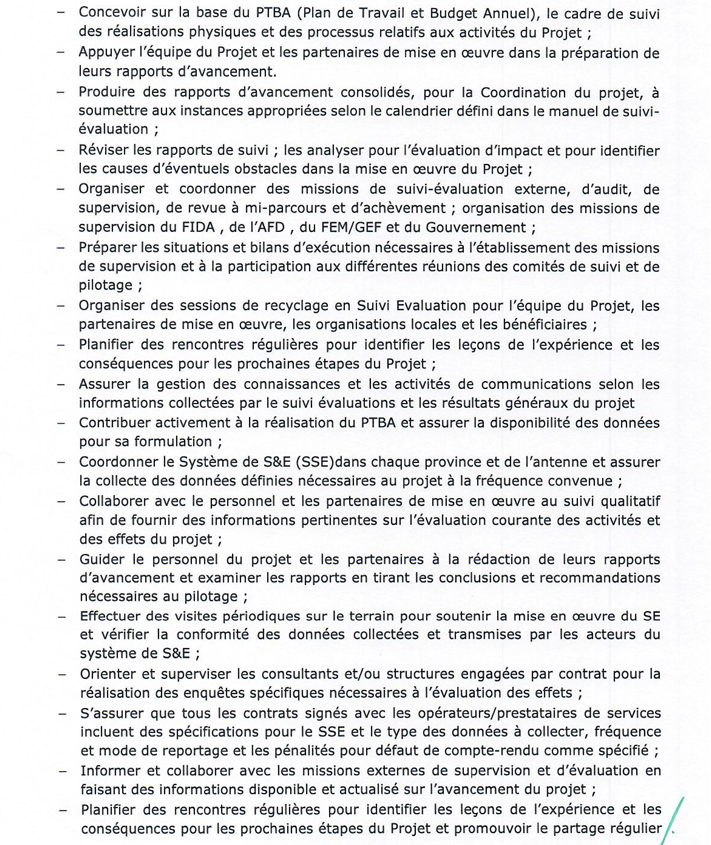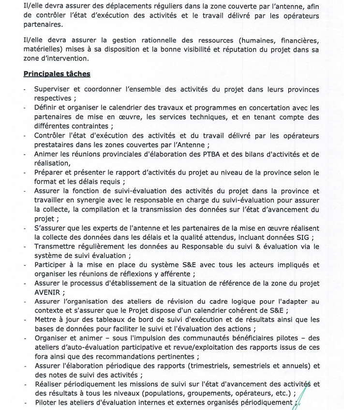 | Intitulé du poste | COORDONNATEUR NATIONAL ADJOINT ET RESPONSABLE DU SUIVI-EVALUATION DU PROJET AVENIR | |