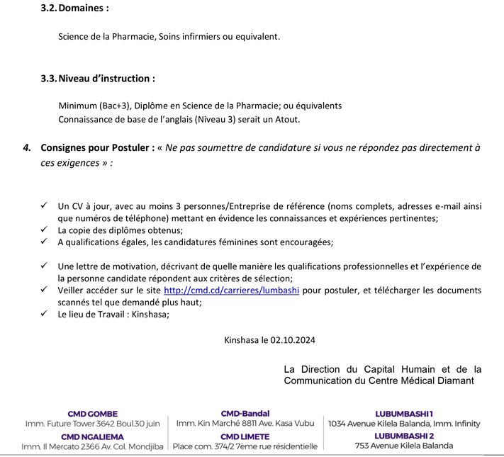 - Veiller accéder sur le site https://cmd.cd/carrieres/lumbashi pour postuler, et télécharger les documents scannés tel que demandé plus haut;