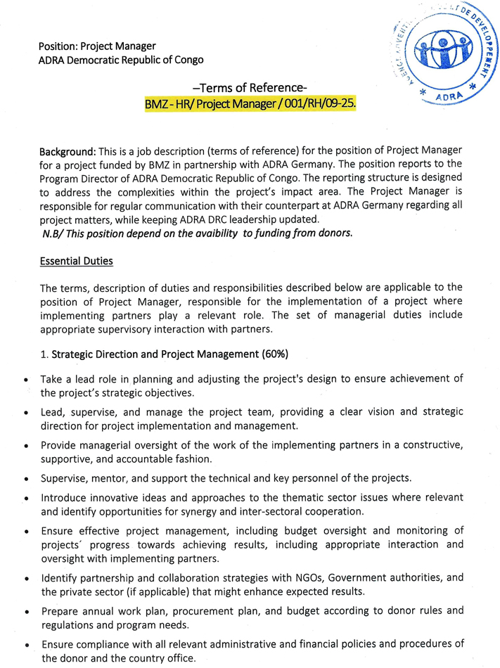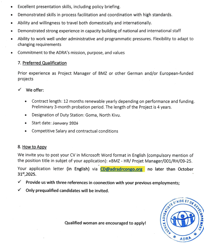 l’adresse email pour postuler | cd@adradrcongo.org |