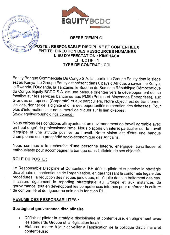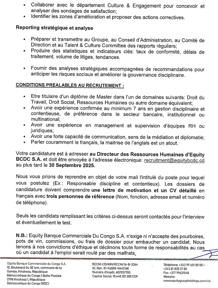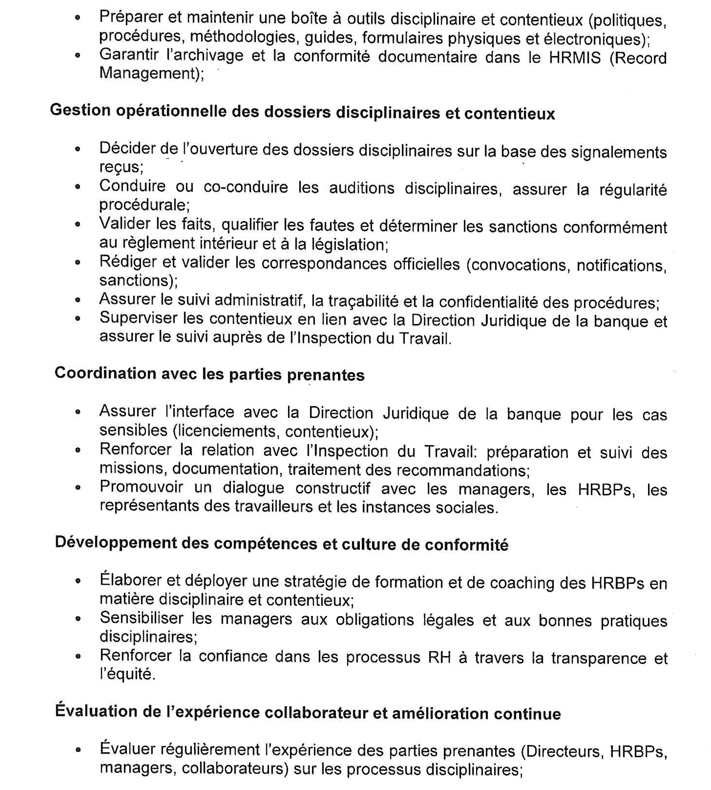 NUMERO DE REFERENCE : DRH/2025/1005Intitulé du poste | RESPONSABLE DISCIPLINE ET CONTENTIEUX | |